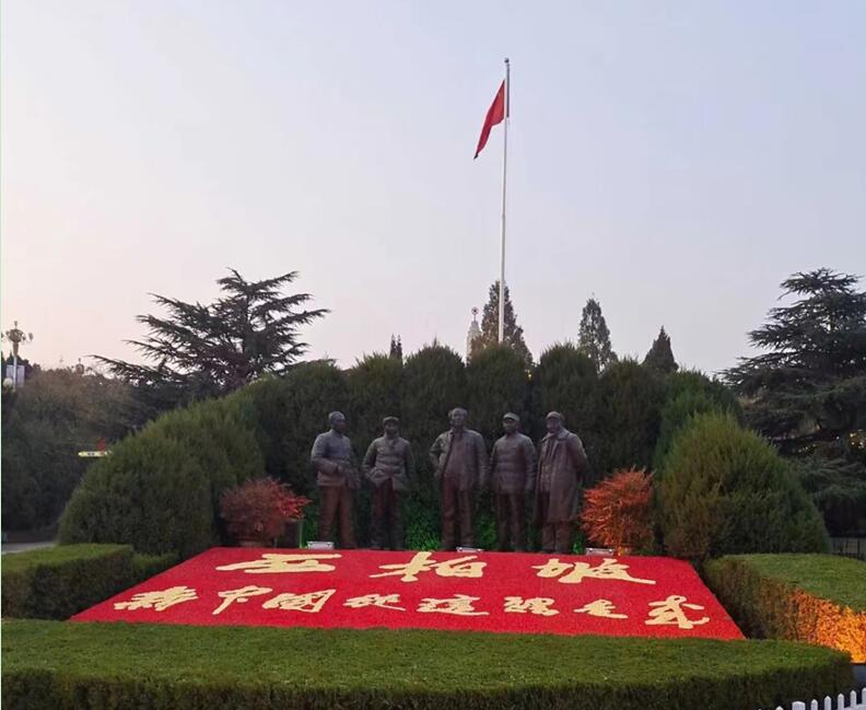 在纪念馆广场上,绿树掩映鲜花簇拥着毛泽东、朱德、刘少奇、周恩来、任弼时五大书记铜像。