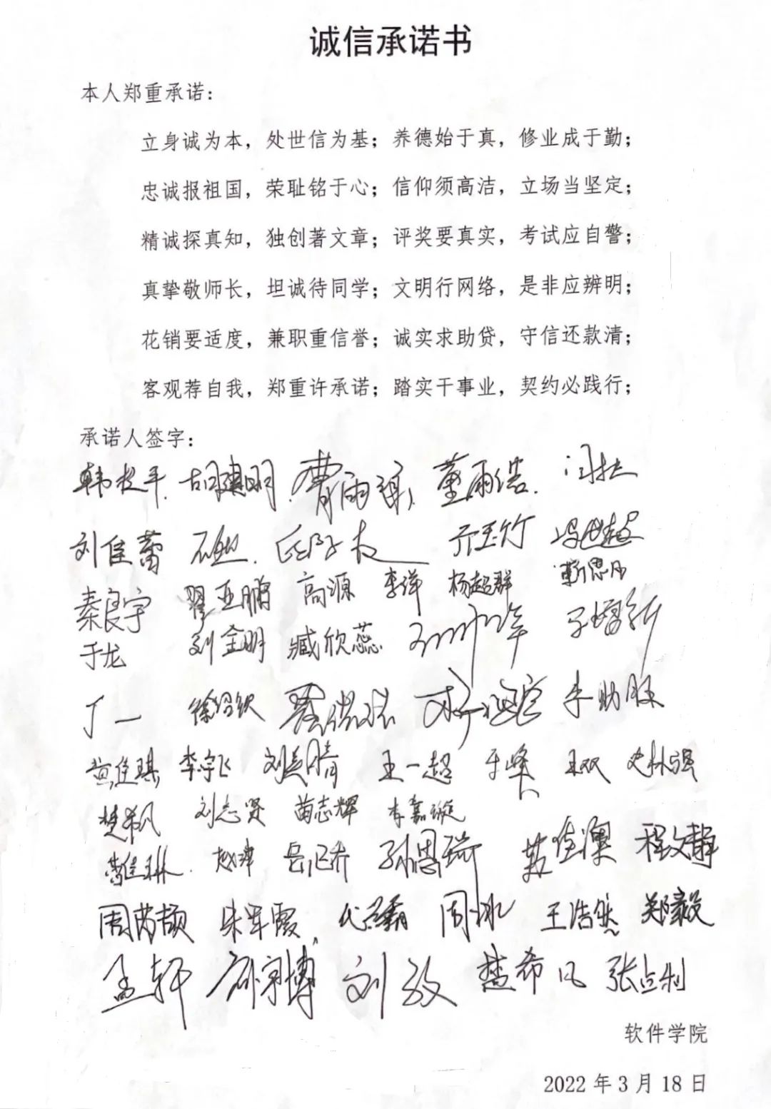此次活动意义显著,丰富了员工诚信精神世界,更好的让同学们明白了诚信真正的含义,同时也营造了诚信友好的氛围。今后软件学子要继续参加到诚信公约的活动中,坚定理想信念,提高老员工对诚信的深刻理解号召大家养成自律的好习惯 。