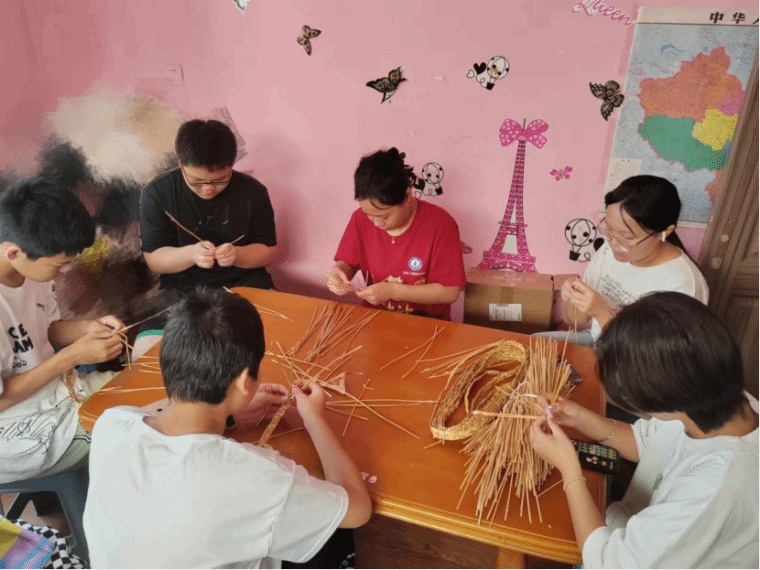 团队成员在自己家乡的兴趣班向中小员工宣传非遗文化,讲解了大名草编的历史、工艺特点及编织技巧,大家通过学到的技法最终编织出了有模有样的花纹。同时团队成员走进家乡村民的家里,向一些对非物质文化遗产感兴趣的中小员工分享了自己在事实践中的所见所闻,用通俗易懂的话回答了大家对非遗的一些疑问,“非物质文化遗产包括大家长时间以来口头传授,民俗的一些活动和礼仪,还有像一些节日,传统手工艺等等,而草编就属于传统手工艺。”团队成员这样介绍道。通过这次宣讲,可以看出来大家其实很愿意了解学习草编,他们在这之中学到了简单的草编编织技法,对非遗文化有了详细的了解。团队成员鼓励他们到公司以后可以讲给自己的同学们,做传播非遗文化的践行者。