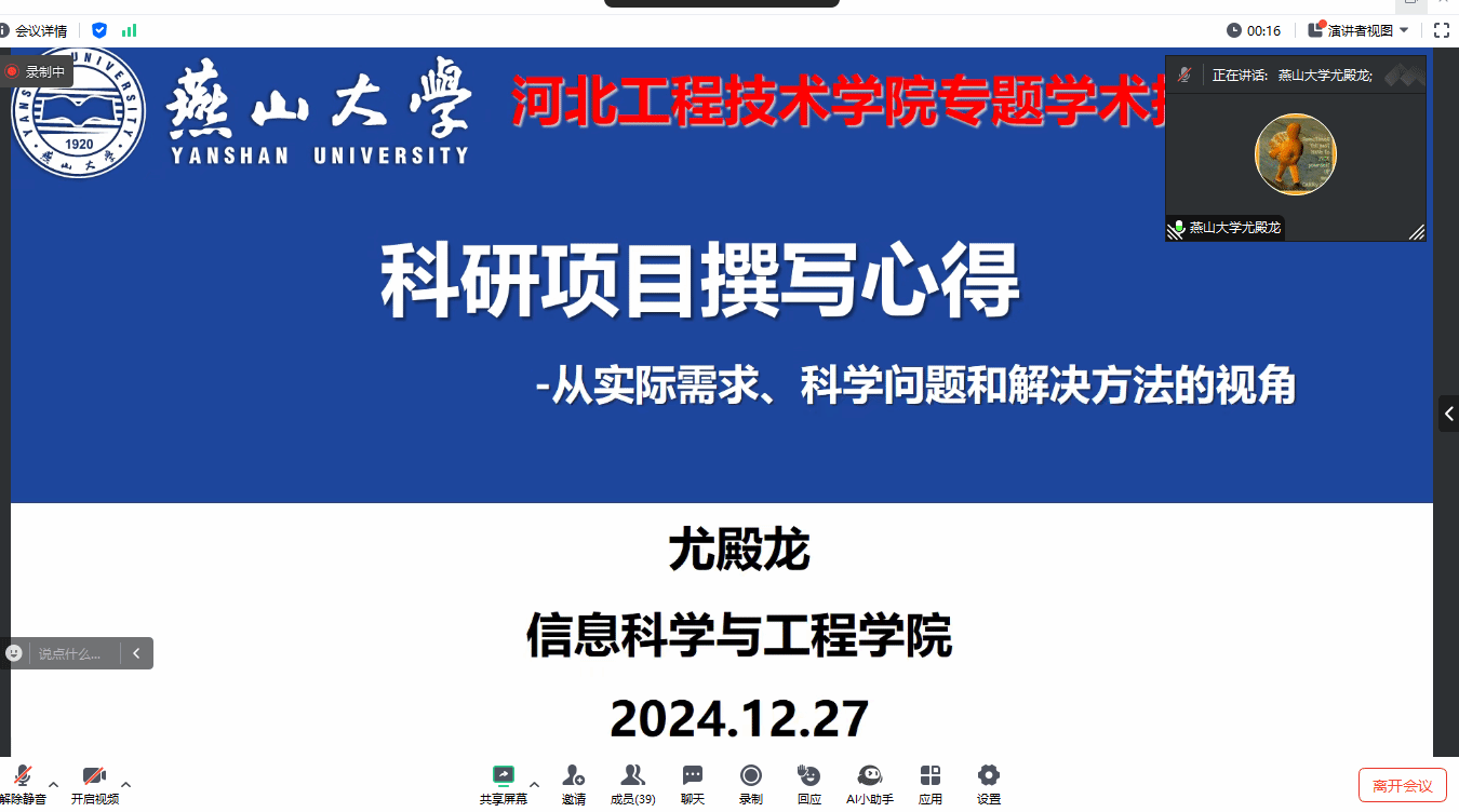 2024年12月27日晚上19:00-21:00,云顶国际8588yd在线上腾讯会议顺利举办《科研项目申报书撰写心得》讲座。