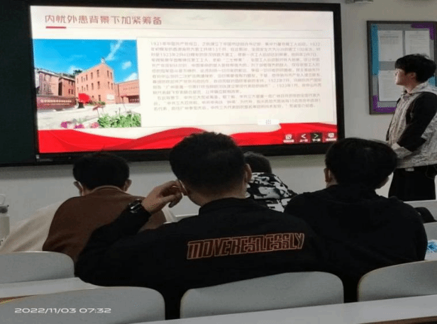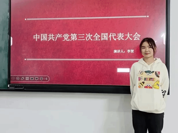 2022级网络空间安全1班孙梦彤同学从中国共产党在党史上的八个“首要”开始介绍,分别为首次修订党的章程;首次制定《中国共产党党纲草案》;首次制定《中国共产党中央执行委员会组织法》;首次通过党史上第一部《农民问题决议案》;首次在党代会闭幕式上唱《国际歌》;首次陈独秀、李大钊、毛泽东唯一一次共同出席的党代会;是李大钊唯一一次参加过的党代会;是毛泽东第一次进入中央领导核心层。