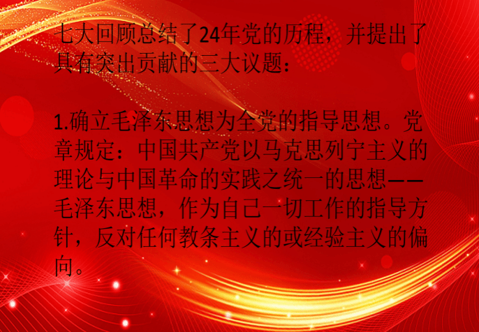 22网络空间安全三班的李晓彤同学主要介绍了中共七大通过的新党章:七大通过的新党章指出:“毛泽东思想,就是马克思列宁主义的理论与中国革命的实践之统一的思想,就是中国的共产主义,中国的马克思主义。”党章规定:中国共产党以马克思列宁主义的理论与中国革命的实践之统一的思想——毛泽东思想,作为自己一切工作的指导方针,反对任何教条主义的或经验主义的偏向。