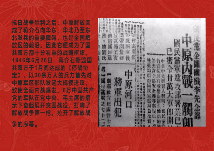 抗日战争胜利之后,中原解放区成了蒋介石向华东、华北乃至东北发兵的重要障碍,也是全国解放区的前沿。因此它便成为了国共双方都十分看重的战略枢纽。1946年6月,蒋介石撕毁《停战协议》,对中原军区部队发起大规模进攻,致使全面内战爆发。面对国民党军队的大规模进攻,中原解放区共产党人民军队奋起自卫。下面由各位同学讲述“中原突围,奋起自卫”的故事。