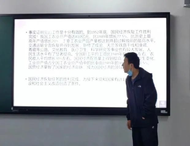 2022级网络空间安全二班的梁博涛同学介绍了"统一财经,恢复经济"的时间段:1949年10月﹣1952年、措施:平衡财政收支,稳定物价、恢复交通运输业、恢复农业生产。2022级软件工程一班的范佳宇同学讲解了"统一财经,恢复经济"的中心任务:巩固新生的人民政权,迅速恢复国民经济。