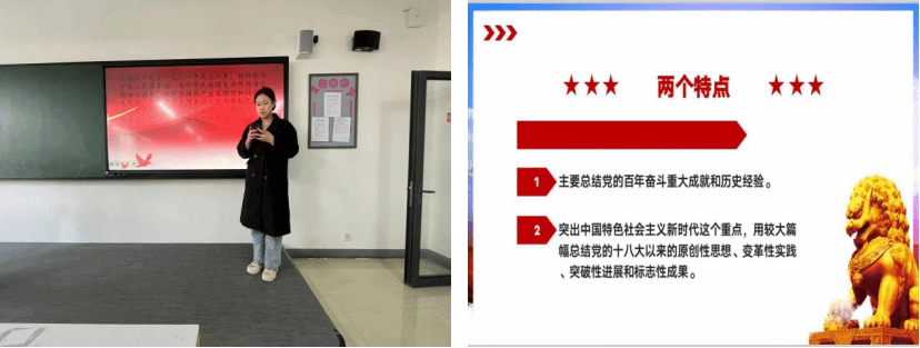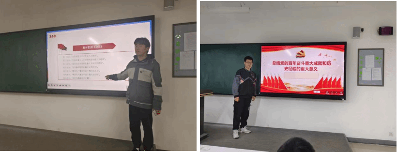 2022级软件工程六班的张守苑同学为同学们讲述了《决议》中强调党确立习近平同志党中央的核心、全党的核心地位,确立习近平新时代中国特色社会主义思想的指导地位,反映了全党全军全国各族人民共同心愿,对新时代党和国家事业发展、对推进中华民族伟大复兴历史进程具有决定性意义。《决议》内容有两大特点,分别是:主要总结党的百年奋斗重大成就和历史经验和突出中国特色社会主义新时代这个重点,用较大篇幅总结党的十八大以来的原创性思想、变革性实践、突破性进展和标志性成果。