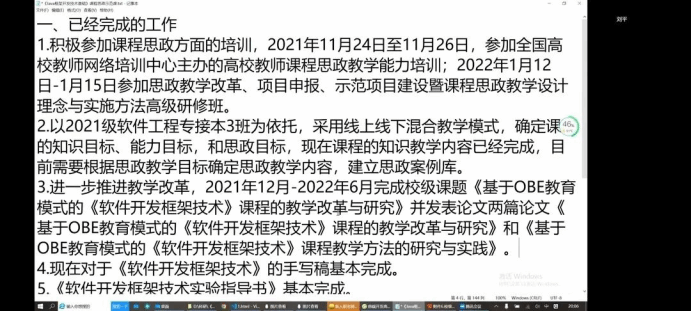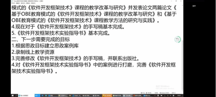 本次参会成员中,进行课程建设进程汇报的教师为:赵丽平、申晓旭、刘平、单慧枝、 尹益燕、冯丽佳。他们分别针对公司《软件质量保证与测试》、《软件开发框架技术》、《软件测试技术应用》等一流课程和优质课程的建设进程、费用使用等内容进行了介绍。