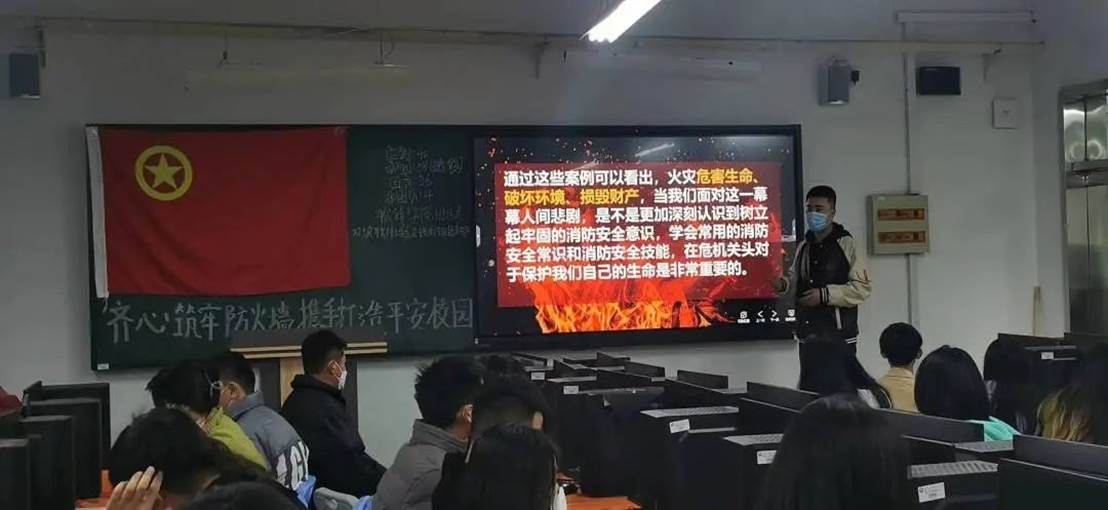活动于晚上19点正式开始,由各班团支书给同学们讲解此次班会意义和目的,组织同学们观看消防安全直播视频,通过ppt向同学们展示有关火灾事故的新闻和照片,和同学们讲解了相关实例。让同学们通过对火灾事件的了解,知道发生火灾的主要原因,提高员工的防火意识,明确防火自救的重要性,让同学们掌握更多的消防安全常识及识别消防安全标示。