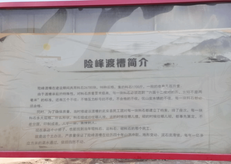这是百度百科上对险峰渡槽的介绍,初次看到这组数据的我,并不深以为然,然而当我真正站在这座二百米长,三十米高的渡槽上时,脑中突然涌入一堆想法。既有急迫想下去的念头,也有对之前无知的自己的责备,但更多的是对先辈们在缺少大型机械下建造出这座渡槽的敬佩。