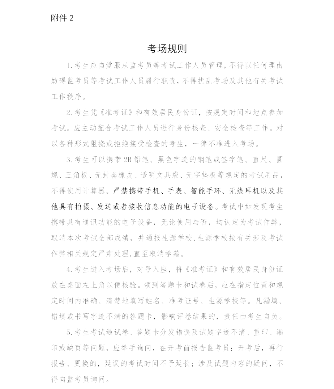 考场内均安装视频监控系统,考试期间全程录像。考生须自觉遵守《考场规则》(附件2),配合考试工作人员做好身份验证和违禁物品检查。对于不遵守《考场规则》、不服从监考员等考试工作人员管理等违规行为,将按照《中华人民共和国教育法》《国家教育考试违规处理办法》等法律法规严肃处理;涉嫌犯罪的,移送司法机关追究法律责任。