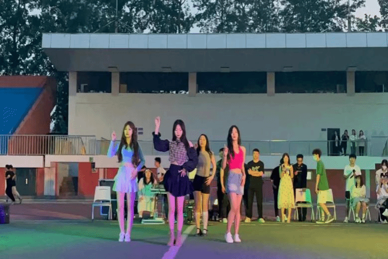 洒在操场上,正在锻炼的同学迎着朝阳奔跑。