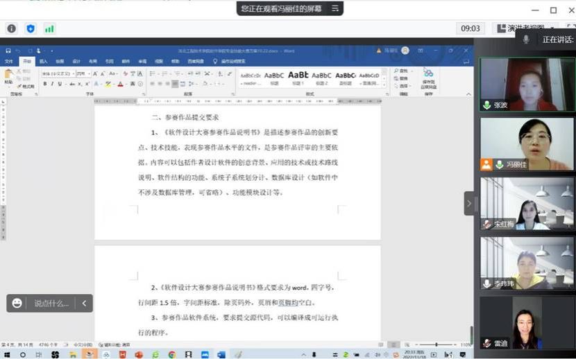 本次评审工作,由冯丽佳老师进行主持,评审委员包括张波、李玮玮、宋红梅、雷迪等教师代表。首先冯老师对本次比赛的目的、员工作品的评分标准进行说明。接着对员工作品进行一一展示,最后由评审委员进行线上打分。